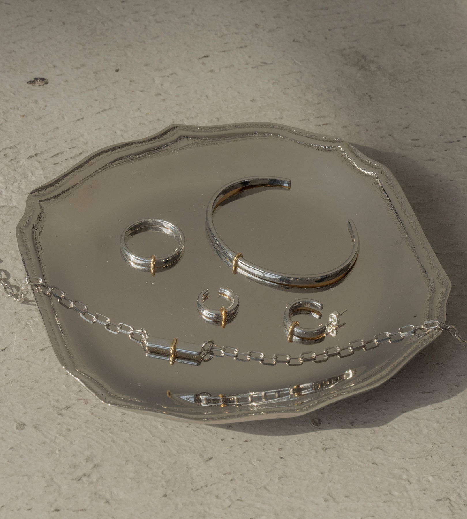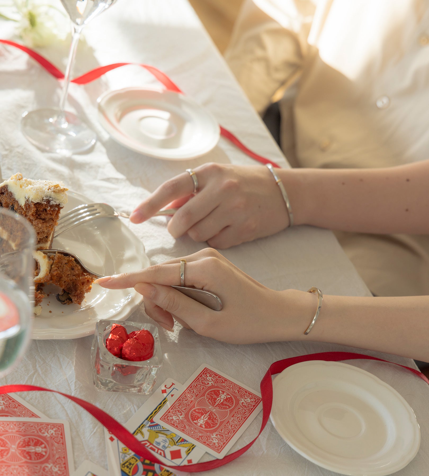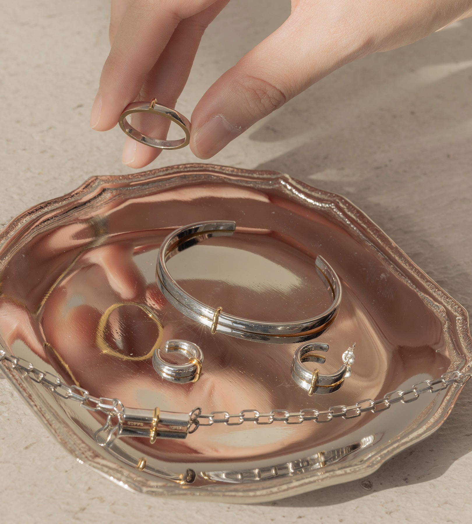 ・水分が付着したままになりますと、変色の恐れがございます。ご入浴やプール、水仕事など長時間水に触れる環境下ではご着用をお控えください。